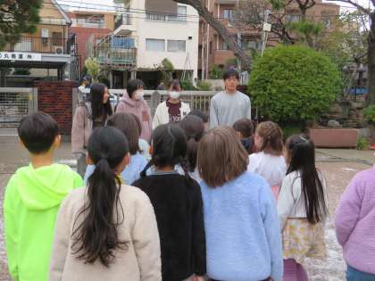 写真は、6年生にきちんとあいさつをする2年生の様子です。