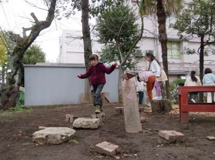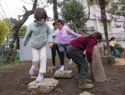 写真は、いわ跳びで遊んでいる1年生の様子です。