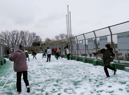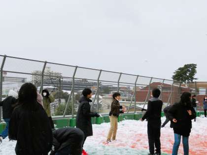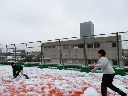 残念ながらパウダースノーではなく、べちゃっとした雪でした。しかし、せっかくの雪でしたので6年生優先で屋上で雪遊びをしました。