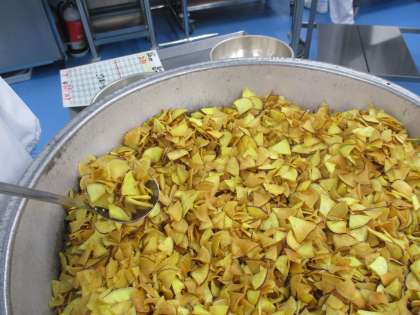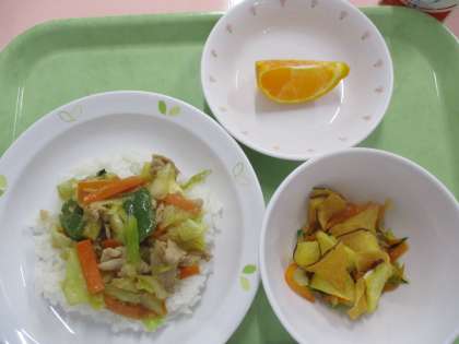 今日は「さつまいものサラダ」です。さつまいもをいちょう切りにカットしてチップスにして野菜の上にのせ、混ぜ合わせます。カリッとした食感を味わえるといいですね。