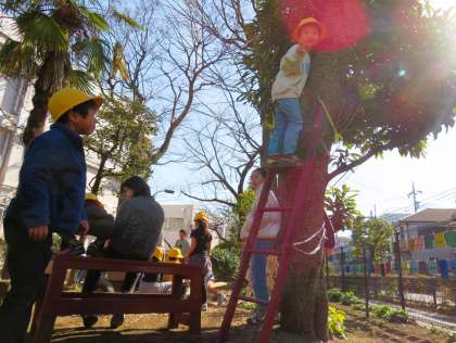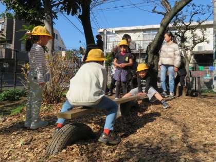 写真は、木登り、シーソーで遊んでいる1年生の様子です。