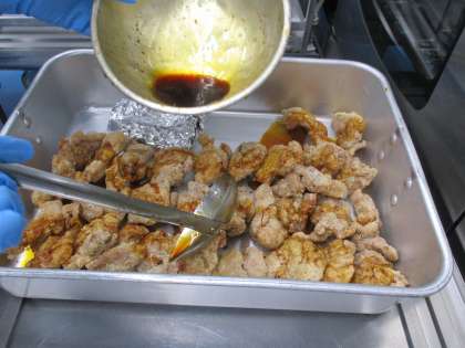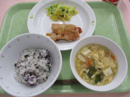 今日は「鶏肉のフリッター」です。今日は鶏肉に片栗粉をまぶし油で揚げて、甘辛いたれをかけました。鶏肉にはたんぱく質が多く含まれていて、疲れた身体を元気にしてくれます。