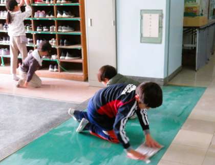 1年生にはなかなか難しい面もありますが、真剣に取り組んでいます。掃除を通して「見つける心」「我慢する心」「親切な心」を磨いていきます。