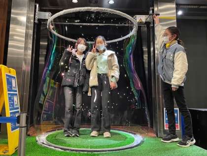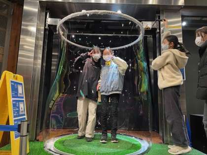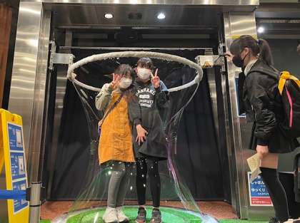 シャボン玉の大きさはかなりのもので、大人でもすっぽりと入ることができます。七色に光るシャボン玉の中はとっても神秘的です!