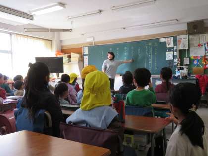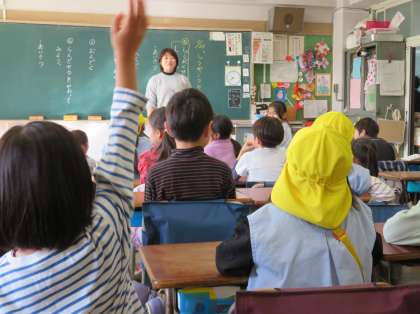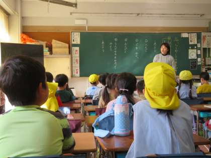 まずは、小学校の教室で椅子に座って、あいさつとお返事の仕方の勉強です。