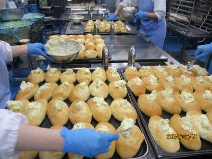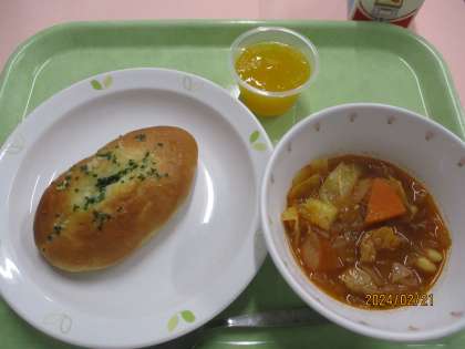 今日は「ポークビーンズ」です。豚肉と豆を使用したスープシチューです。野菜は。玉葱・人参・キャベツ・ニンニク・しょうがを使用しています。味付けはトマトケチャップとソースです。