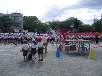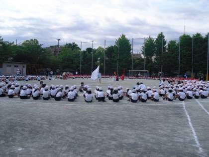 運動会まであと1週間。1時間目は全校練習をしました。今日は応援の練習もしました。だんだん本格的な練習に、子どもたちも気持ちも高まってきているようです。応援合戦を見ていると、本番が楽しみになります。子どもたちは、演技が終わるたびに得点経過を気にして、一喜一憂するのでしょう。