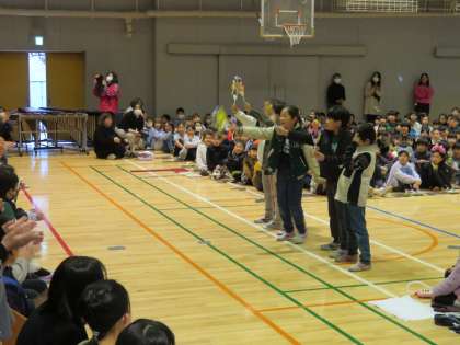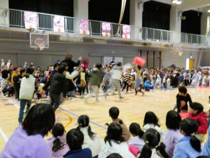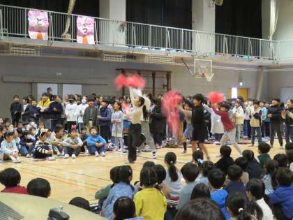 トップバッターは4年生です。6年生が5年生の時の運動会で、ソーラン節の前に踊っていた「青と夏」の歌詞を替え歌にして感謝を伝えるとともにダンスで踊りました。会場を巻き込むウェーブも入れて盛り上げ、感謝の気持ちを表しました。