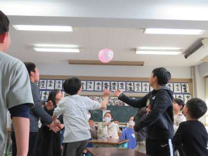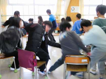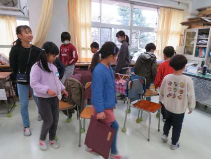 「椅子取りゲーム」で遊んでいる班の様子です。