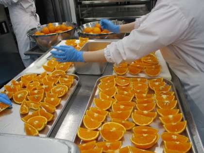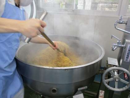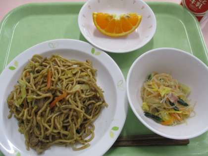 今日は「ソース焼きそば」です。豚肉のばら肉・玉葱・人参・キャベツ・もやし・にらを使用して作っています。果物は「きよみ」というみかんです、旬のくだものです。よく嚙んで、おいしくいただけるといいですね。