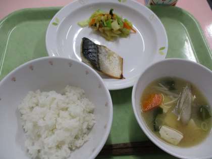 今日は「さば」です。鯖には質の良いたんぱく質が多く含まれています。筋肉の維持を期待できます。鉄分も多いので身体が疲れにくくなります。鯖の下味はすばらしく美味しい味にできています。今日は「有機米」を使用しています。農薬や化学肥料に頼らず水田が本来もっている生産力を引き出して栽培されたお米です。