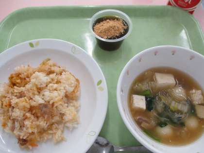 今日は「キムタクチャーハン・春雨スープ」です。6年生のリクエスト給食です。キムタクチャーハンも春雨スープにもたくさんの野菜を使用しています、野菜をたくさん摂取できますね。