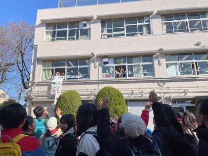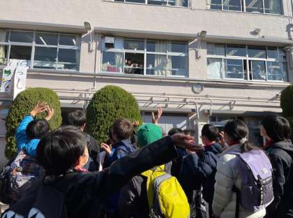 5年生が出発するときに、6年生が「いってらっしゃーい!」と、温かく手を振って見送ってくれました。温かい学校です!