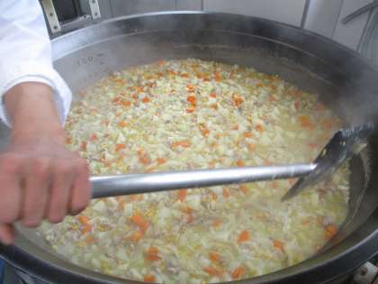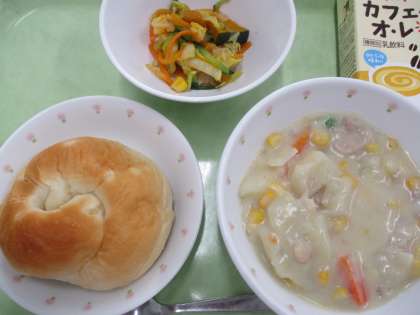 今日は「コーンシチュー」です。シチューとコーヒー牛乳が6年生のリクエストです。コーン・玉葱・人参・鶏肉・じゃが芋が入っています。米粉と豆乳で作っています。