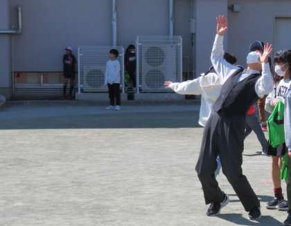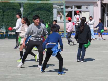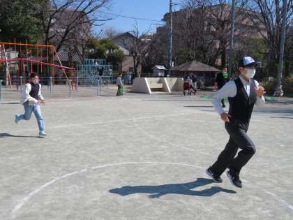私は、5年生と一緒に鬼ごっこです。不意を突かれてタッチされてしまいました!