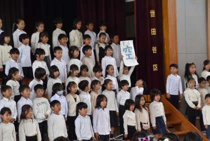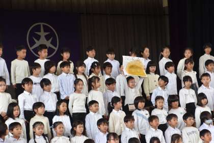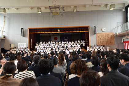2年生による「歓迎のことば」です。心のこもった呼びかけや学校生活の様子、「こいぬのマーチ」の合奏をしている姿に、1年間の成長を感じました。