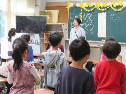 私は1年生の教室をはじめ、すべての教室をまわっています。姿勢正しく先生の話を聞いている子どもたちに感激です。松丘小学校の1年生は、みんな勉強が大好きな子どもたちに見えました。
