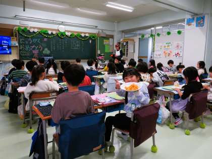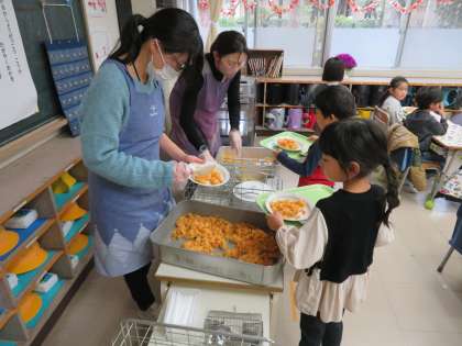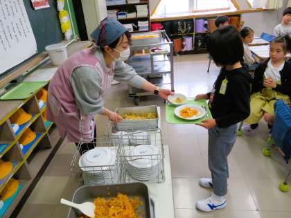 今日から、子どもたちが楽しみにしている給食がはじまりました。1年生は、しばらくの間、配膳は先生が行います。1年生は、初めての給食にワクワクドキドキです!