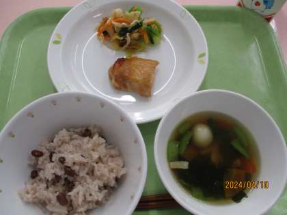 今日から給食が始まりました。「お赤飯」で、ご進級・ご入学をお祝い申し上げます。良い年度でありますようにという意味合いがありますね。
