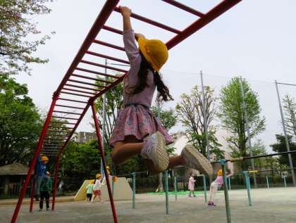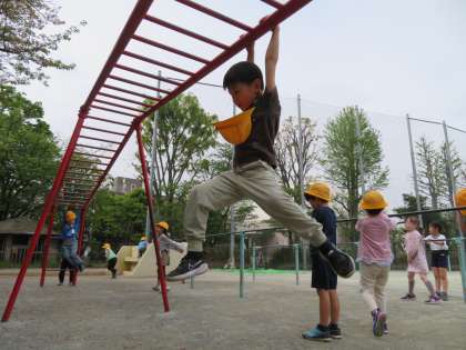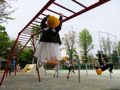 始業前の「朝遊び」の時間から、1年生が校庭遊びにデビューしました。まずは、うんていや登り棒、ジャングルジムなどの固定遊具で遊びました。