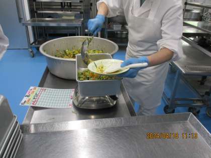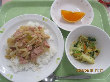 今日の給食は「焼き豚丼」です。豚肉・玉葱・こんにゃく・油揚げを使用しています。甘辛く味付けをしています、ご飯にかけて食べましょう。