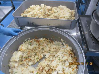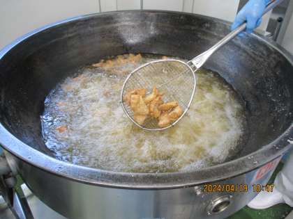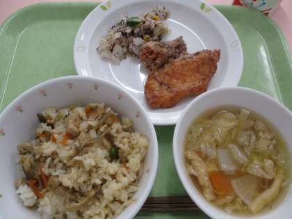 今日は「たけのこごはん」です。たけのこ・ごぼう・鶏肉・人参・油揚げ・グリンピースを使用しています。たけのこは今が旬ですね、美味しくいただけるといいですね。