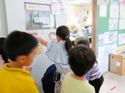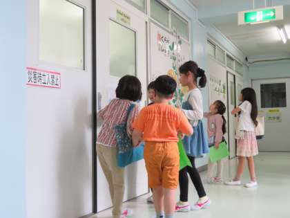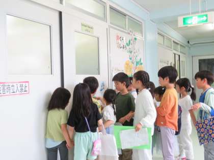 1年生をリードしながら、校長室、職員室、主事室、体育館、図書室、展望廊下など、それぞれの場所に案内しました。
