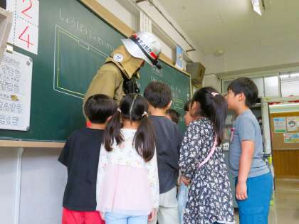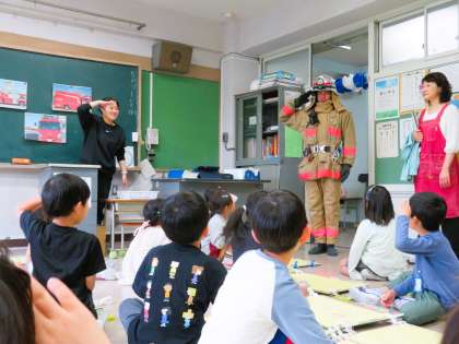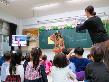 特別に、教室にも消防士さんに来ていただき、いろいろな質問やかっこいい「敬礼」のポーズも教えてもらいました!