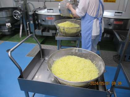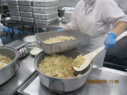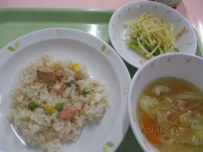 今日は「鮭チャーハン」です。ころころとした鮭がかわいらしく混ざっています。黄色のコーンが彩りを増して、食欲をそそります。今日から5月です。たくさん食べて強い身体をつくれるといいですね。