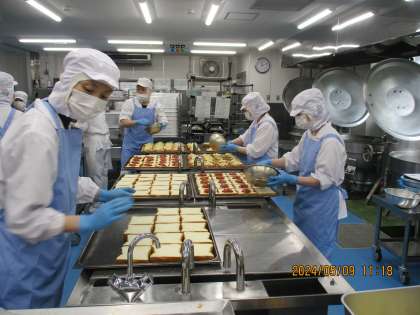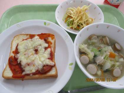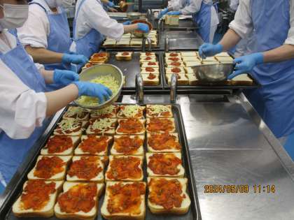 今日は「ピザトースト」です。トマトペーストを作り、玉葱・ピーマン・マッシュルームを混ぜ合わせ食パンに塗ってチーズをのせてオーブンで焼いて作っています。一枚一枚丁寧に作っています、美味しくいただけるといいですね。