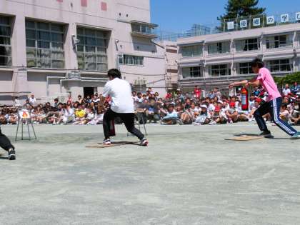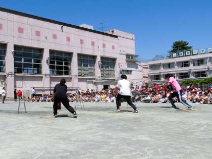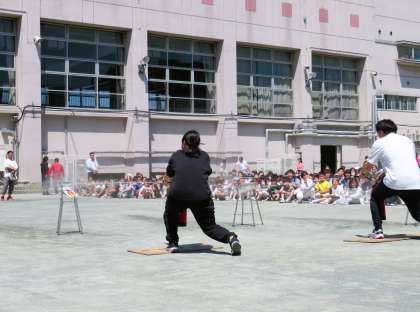 避難訓練後に、教師が水消火器を使って初期消火訓練を行ないました。