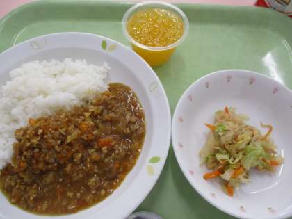 今日は「ドライカレー」です・玉葱・人参・ひよこ豆をみじん切りにして作っています。野菜も多く使用していますが、小さくしているので食べやすいですね。