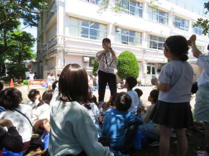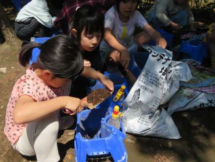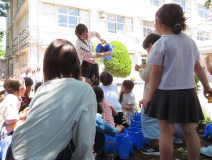 2年生が生活科の学習で「ミニトマト」の苗を植えました。プランターにふかふかの土を半分ほど入れ、ミニトマトの苗をポットから取り出します。苗を浅めに植え込み、再びふかふかの土を寄せるようにして入れて植え付けました。