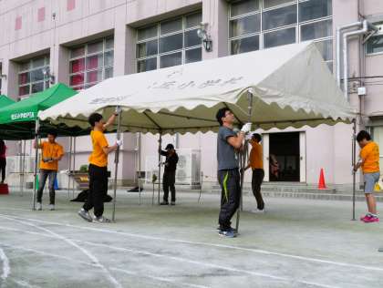 運動会の当日、早朝7時すぎから教職員と松パパクラブの協働作業でテントを張り、会場を整えました。
