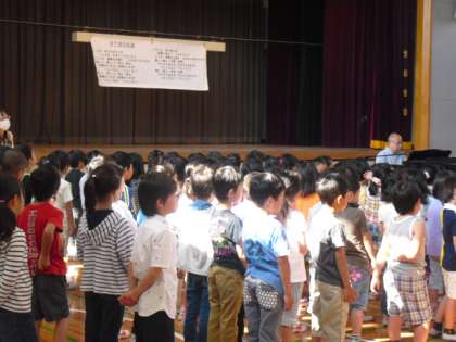 音楽朝会がありました。3年生は上野動物園へ遠足です。体育館には3年生以外の学年が集まり、「すてきな友達」を歌いました。きれいな歌声が体育館に響いていました。はじめは全員で同じパートを歌いましたが、後半は2部に分かれて互いに歌声を聞きあいながら歌いました。すてきな歌声が体育館いっぱいに響きました。