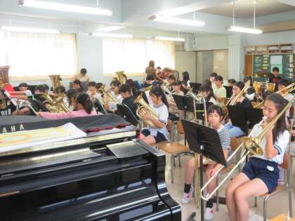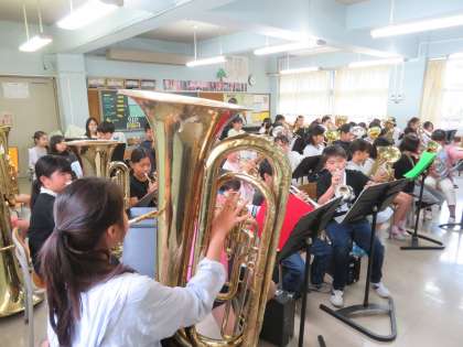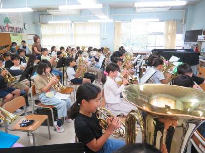 運動会において迫力のある演奏を披露した金管バンドは、翌週から休みなしで活動をしています。現在は「4年生の体験入部」を経て新たに入部してきた、多くの4年生32名の育成がメインです。まずは、音階ロングトーンからはじめています。先輩たちがお手本を見せながらのロングトーンです。