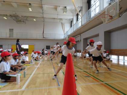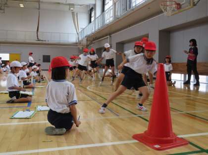 体力テストの様子です。測定種目は「反復横跳び」「上体起こし」「立ち幅跳び」「長座体前屈」「ソフトボール投げ」「20メートルシャトルラン」「握力」「50メートル走」の8種目です。今日は5種目を実施しました。