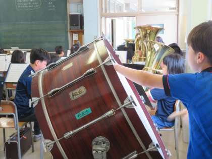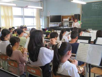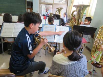 金管バンドは毎朝活動しています。音楽室に入ると、いつも気持ちのいいあいさつがあり清々しい気持ちになります。現在は、新たに入部してきた多くの4年生32名の育成がメインです。まずは、音階ロングトーンからはじめています。先輩たちがお手本を見せながらのロングトーンです。