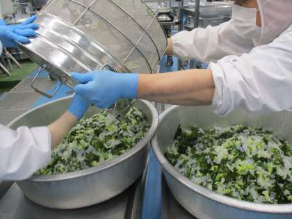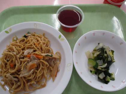 今日は「塩焼きそば」です。豚肉・たけのこ・人参・玉葱・もやし・にら・しょうが・にんにくを使用して作っています。こんにゃくのサラダも一緒に美味しくいだだけるといいですね。