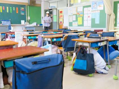 6月の避難訓練は、朝遊びや朝学習中に地震が発生、その後に家庭科室から火災が発生という想定で行いました。子どもたちは、「お・か・し・も・ち」の約束を守り、素早く、そして真剣に避難訓練に取り組みました。