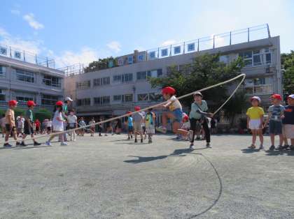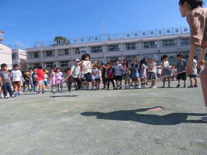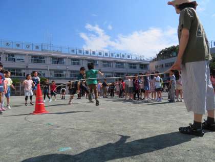 今日は、1・3・6年生の体育朝会です。長縄跳びは、学級のチームワークづくり、運動感覚づくりにはとてもよい運動種目なので全校で取り組みます。