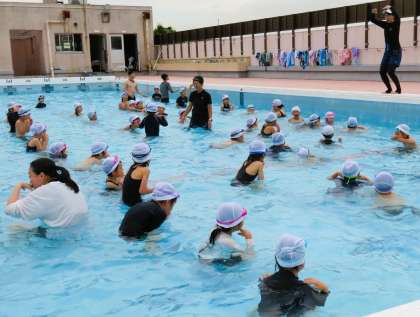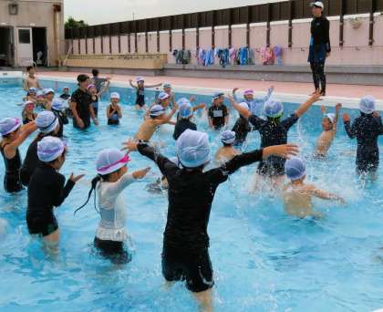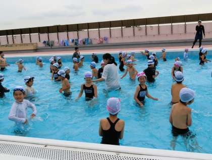 水の中を歩いたり走ったり、水に顔をつけたりしました。少しずつ、もぐったりしたりして、水に親しみました。水遊びの心得を守って、安全に気を付けて学習をしました。