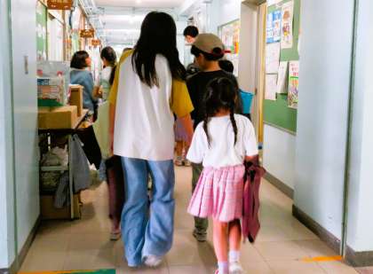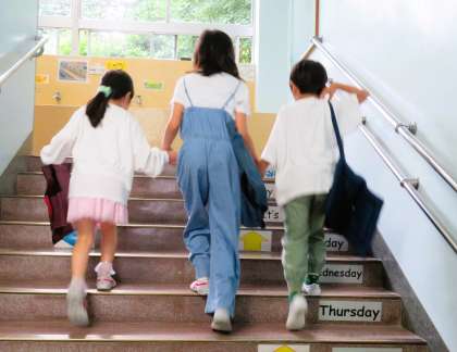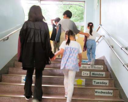 5年生がやさし1年生のお迎えをして、それぞれの教室に案内しています。