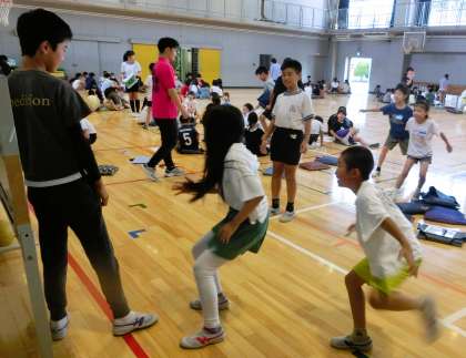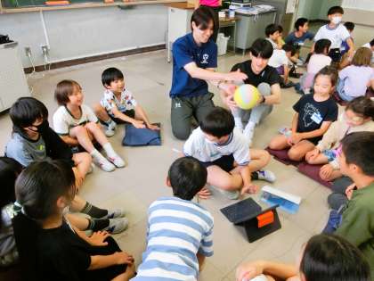 写真は、体育授業の補助先生として来ている、大学院生二人と一緒に遊んでいる班の様子です。