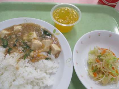 今日は「麻婆豆腐丼」です。ひき肉・豆腐・人参・葱・にら・しょうがを使用して作っています。中華料理のひとつですです。美味しくいただけるといいですね。
