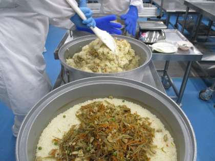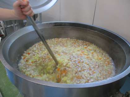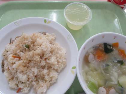 今日は「鶏ごぼうピラフ」です。鶏肉‣ごぼう・人参・グリンピースを使用して作っています。スープにはキャベツ・じゃがいも・人参・セロリー・ウインナー・ベーコンを使用しています、今日も沢山の野菜を美味しくいただきましょう。