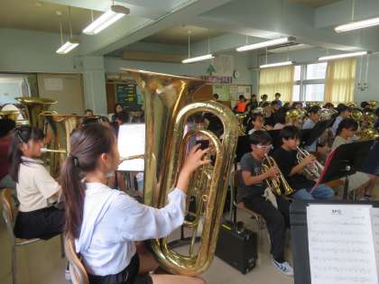 金管バンドは毎朝がんばって活動しています。音楽室に入ると、いつも気持ちのいいあいさつがあり清々しい気持ちになります。まずは、音階ロングトーンからはじめています。先輩たちがお手本を見せながらのロングトーンです。