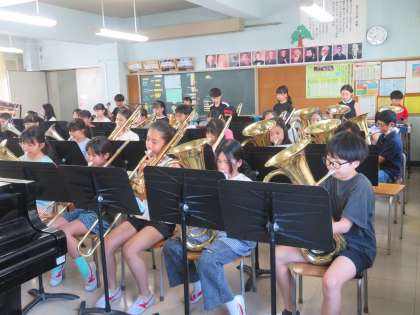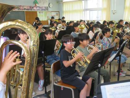 金管バンドは毎朝の練習をがんばっています。音楽室に入ると、いつも気持ちのいいあいさつがあり清々しい気持ちになります。日々、音階ロングトーンからはじめています。先輩たちがお手本を見せながらのロングトーンです。