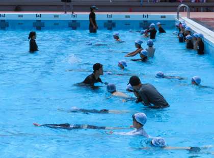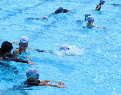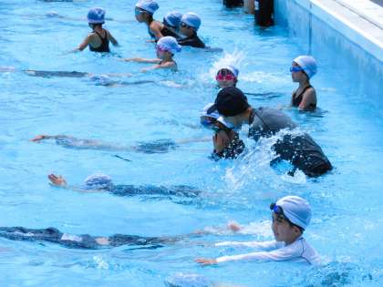 楽しく水遊びをしながら、「浮く」感覚を身に付けられるよう学習を進めています!