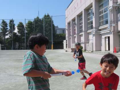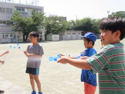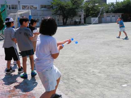 空気と水の性質について学習した4年生・・・。閉じ込めた空気の押す力を使って、水を飛ばすことに挑戦です。みんなで並んで・・・遠くに飛ばすことができたでしょうか!